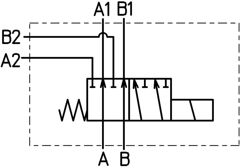 Das 6/2-Wegeventil ist zur Erweiterung einer doppelt wirkenden hydraulischen Funktion geeignet. Stromlos fließt das Öl, von den Anschlüssen A und B, zu den Anschlüssen A1 und B1. Wird der Magnet bestromt, wird der Ölstrom umgelenkt von den Anschlüssen A und B zu den zusätzlichen Verbraucher A2 und B2. Dieses Ventil ist als Grundventil zu verwenden und kann mit dem Artikelnummer 10044 erweitert werden. Dieses Steuerventil kann für verschiedene Betriebsspannungen geliefert werden (12VDC, 24VDC, 220VAC). Geringe innere Leckagen sind zulässig weil das Ventil als Schieberventil ausgelegt ist. Dieses Ventil ist zusätzlich mit Hydraulikschläuchen und Hydrauliksteckern an den Eingängen A und B bestückt. An den Anschlüssen A1 und B1 sowie A2 und B2 sind Hydraulikkupplungsmuffen montiert, so dass eine sehr schnelle Montage und Inbetriebnahme gewährleistet ist. Der Elektrotaster ist nicht in der geschalteten Position gerastet.