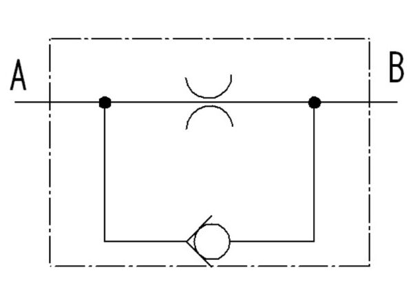 Dieses Drosselrückschlagventil ist in einer erweiterten handelsüblichen Hydraulikverschraubung integriert. Zum Verbraucher hin arbeitet das Ventil gedrosselt fest eingestellt auf 15 L/min. Das abfließende Hydrauliköl ist ungedrosselt.