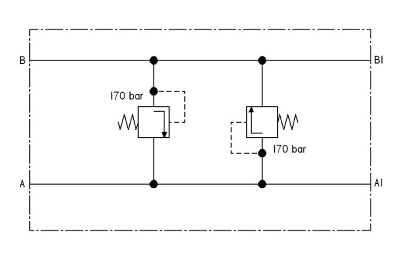 Dieses Ventil ist mit zwei Druckbegrenzugsventilen in einem Gehäuse ausgestattet und für die Leitungsmontage ausgelegt. Die Druckeinstellung ist auf 170 bar festgelegt. Die Druckableitung erfolgt über die Druckseite des zweiten Druckbegrenzungsventiles. Die Ventile sind ungedämpft und entwickeln Geräusche während der Funktion.